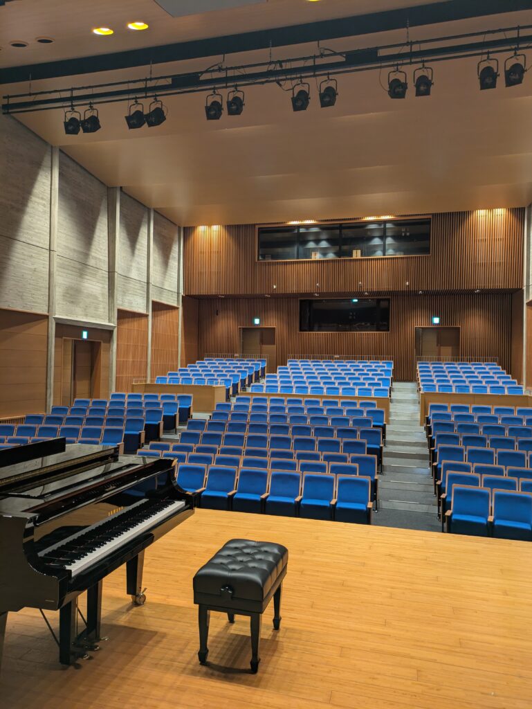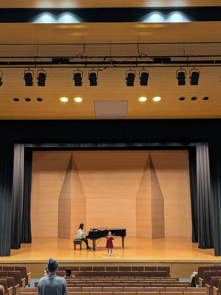 コンクール会場は収容人数約1500人、、、大人でも飲み込まれるこの大きい会場、、、いつものレッスンに追加してホール練習を実施!本番1週間前に本番さながらの練習です✐
